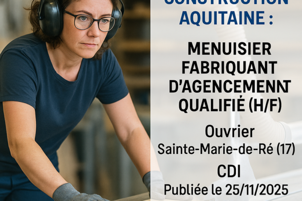 Offre emploi construction aquitaine : Menuisier fabriquant d’agencement qualifié (H/F) Sainte-Marie-de-Ré (17) CDI Publiée le 25/11/2025…