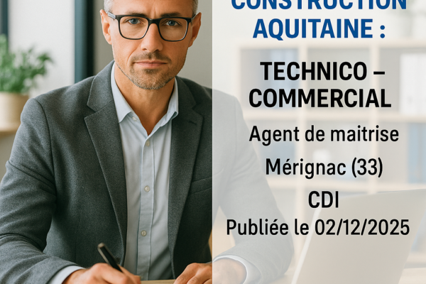 Offre emploi construction : TECHNICO – COMMERCIAL Agent de maîtrise Mérignac (33) CDI Description du poste…