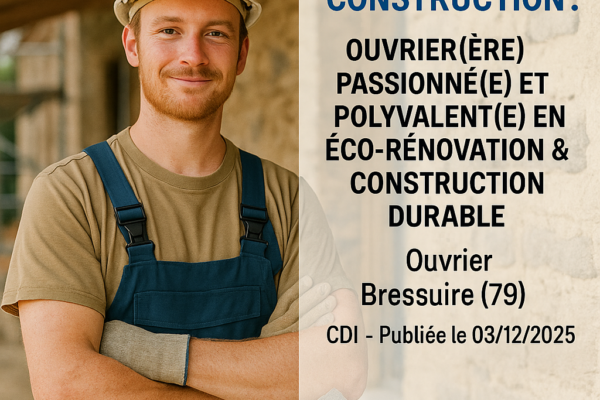 Offre emploi construction : Ouvrier(ère) passionné(e) et polyvalent(e) en éco-rénovation & construction durable Ouvrier Bressuire (79)…