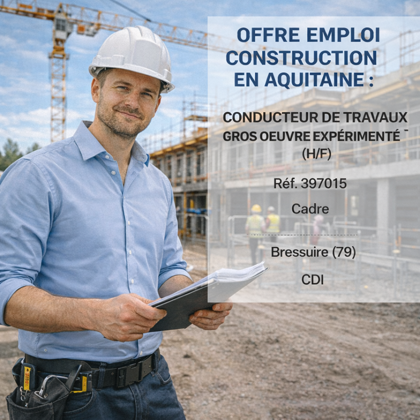Offre emploi construction en aquitaine : Conducteur de travaux Gros Oeuvre expérimenté Cadre à Bressuire (79)…